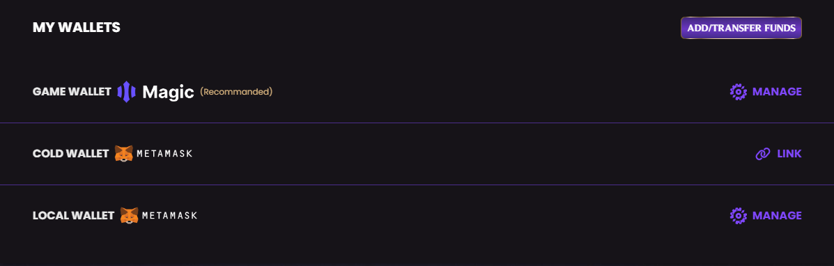 Le **game wallet**, géré et sécurisé par Magic Link, renferme l'ensemble des assets du jeu, NFT ou non. Ici, depuis le CTA Portal, seuls les assets NFT, comme les mint pass, les cartes Éternelles... sont visibles. Ce game wallet est le portefeuille privé du joueur sur la blockchain ImmutableX, couramment appelée IMX. Il prend la forme d’une suite de caractères comme par exemple : 0xa04bcac09a3ca810796c9e3deee8fdc8c9807189.