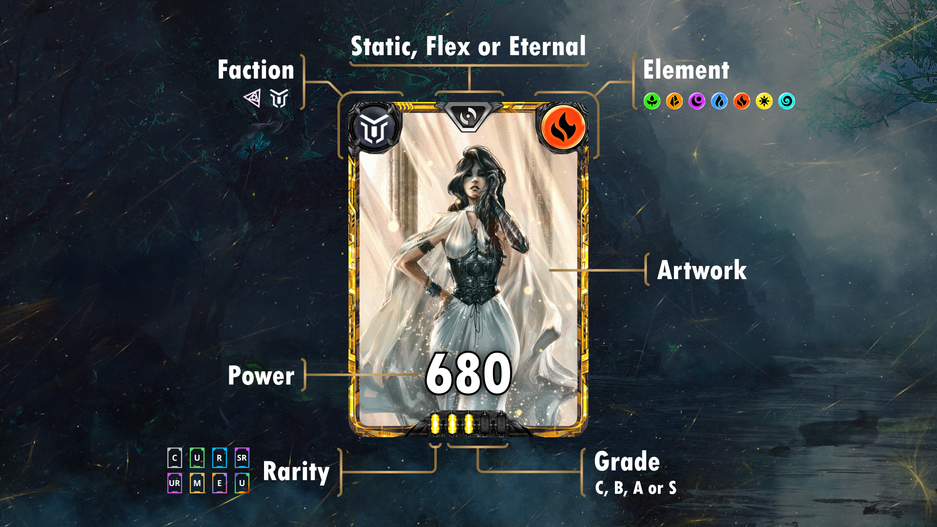 Each card has an element and a power. Other characteristics such as rank and grade exist.\