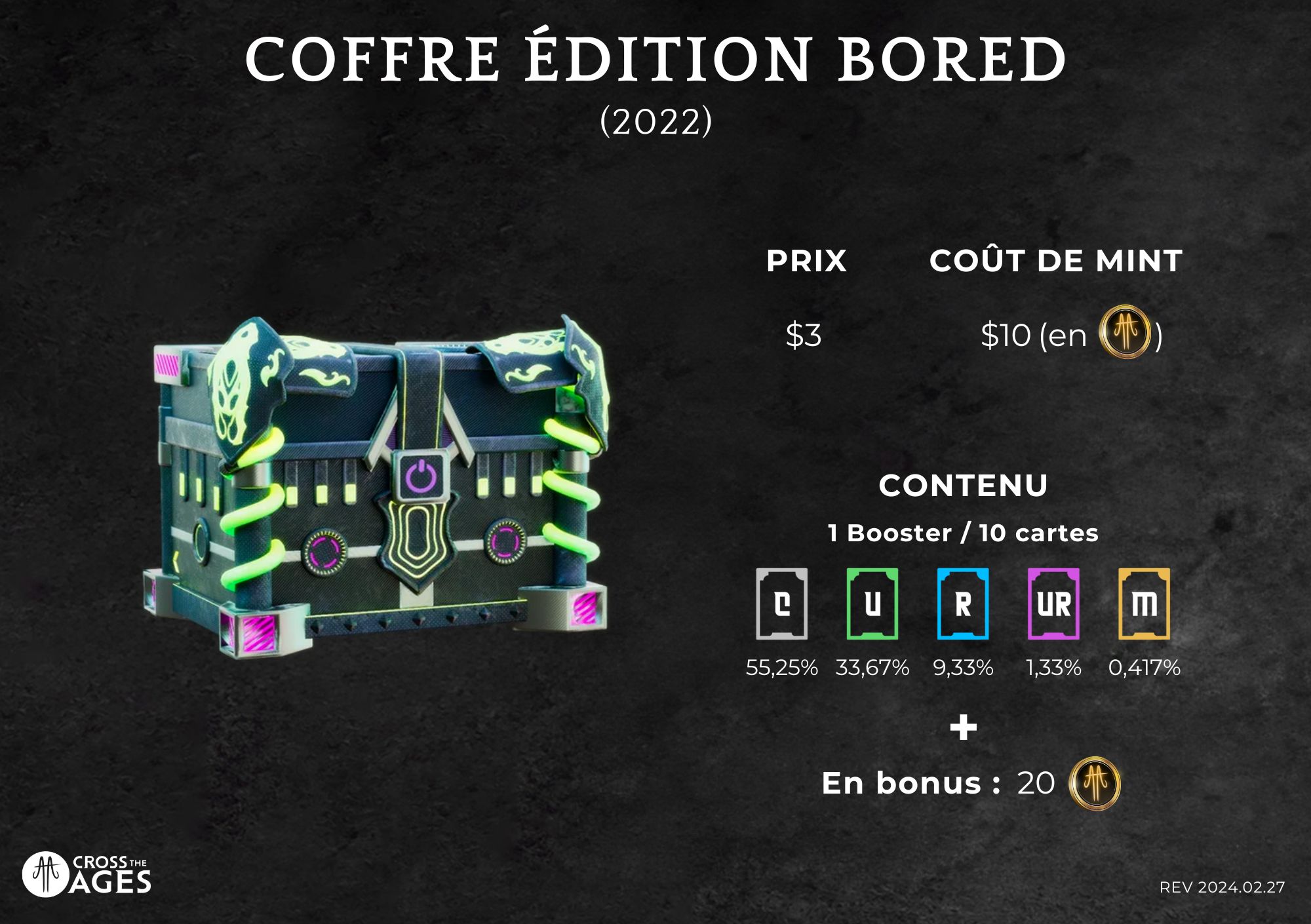 Le coffre Bored est une édition limité à 1 000 exemplaires. Il a les mêmes caractéristiques que le [coffre Basic](#h_01h92htt182p6ppw3ryfbyabt8) avec un bonus de **20 tokens CTA** à l'intérieur.&#x20;