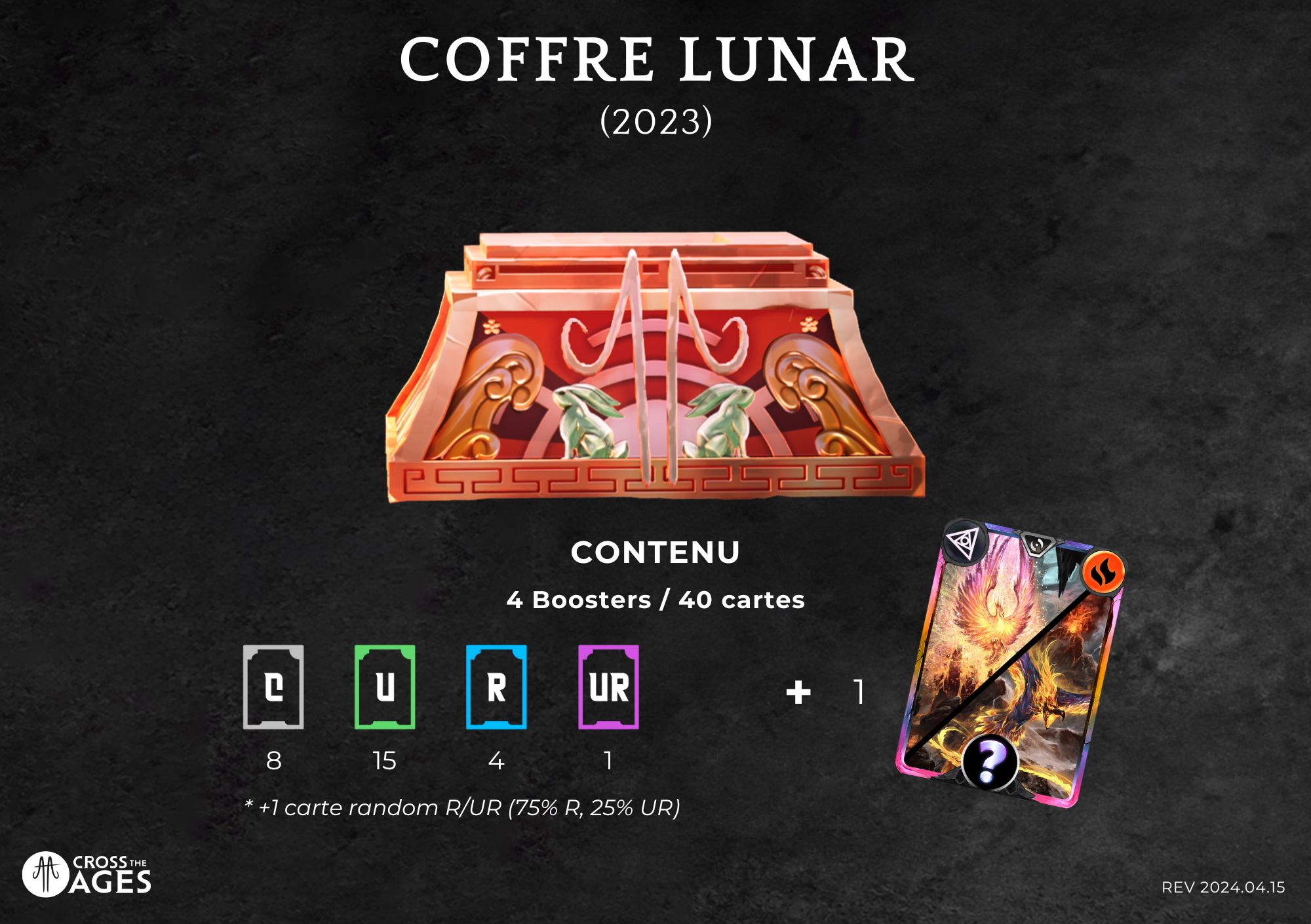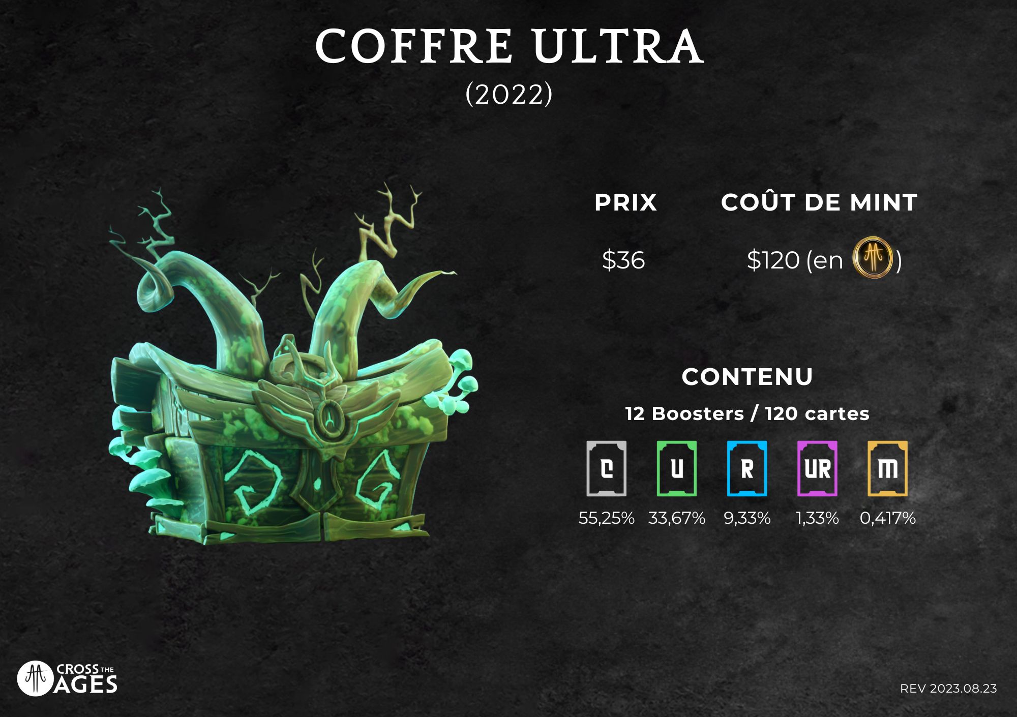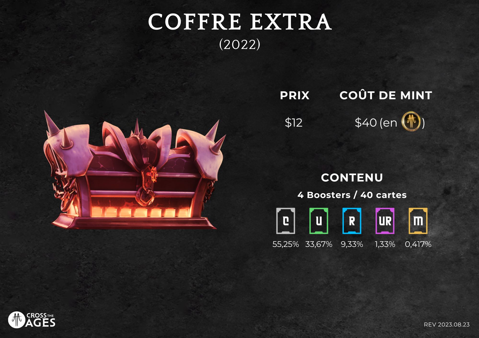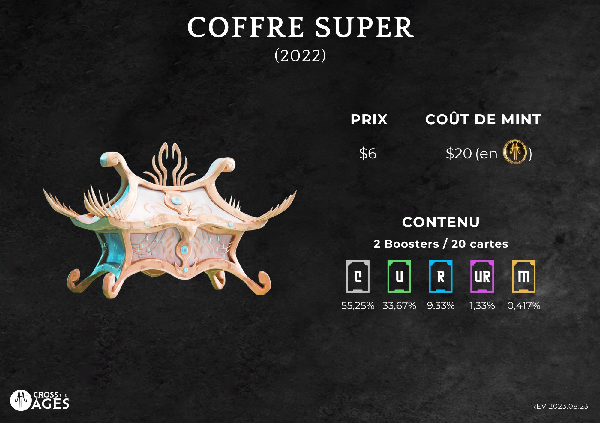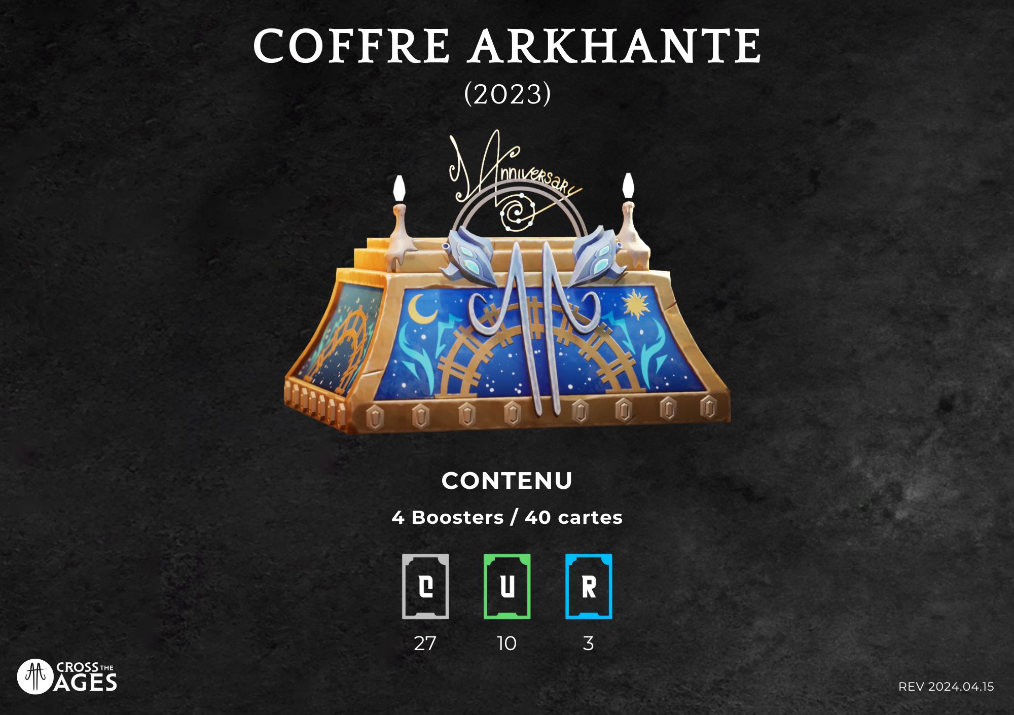 Les coffres étaient disponibles dès le début de la saison 01 Arkhante. Ceux ayant le bandeau "**Early**" sur la [marketplace](https://www.crosstheages.com/portal/marketplace/products/direction=asc\&orderBy=buy_quantity_with_fees\&researchQuery=\&tokenType=CHEST) ont des probabilités d'avoir des cartes UR et M supérieures : C-66,67%, UC-15,28%, R-11,11%, UR-5,56% et M-1,39% contre C-55,25%, UC-33,67%, R-9,33%, UR-1,33% et M-0,417% à la normale.
