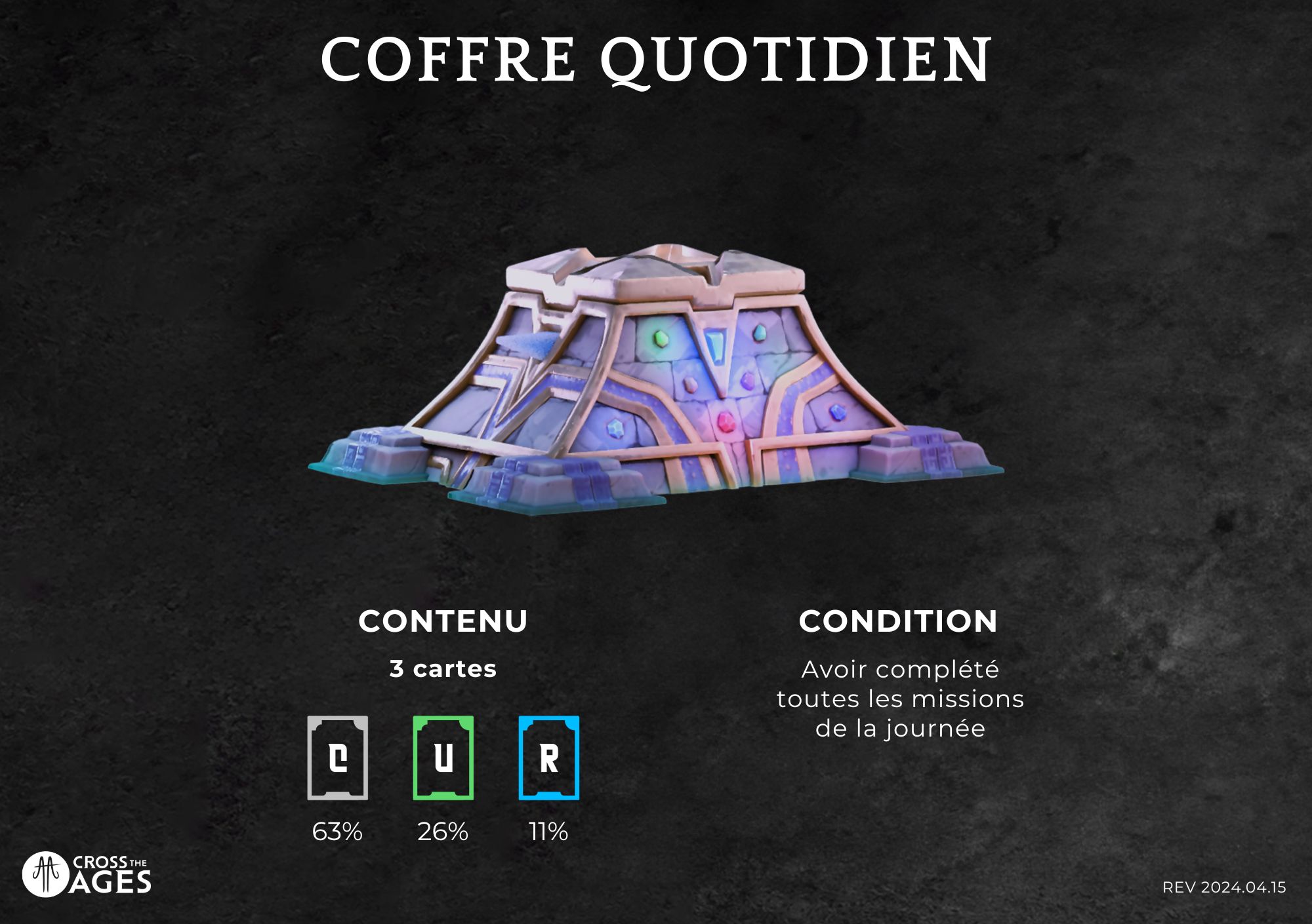 <figure><img src="https://1147870602-files.gitbook.io/~/files/v0/b/gitbook-x-prod.appspot.com/o/spaces%2FxKF8b8siLY5IN4AgOtmZ%2Fuploads%2F6s5wJuGo4yJrUHqF5RCQ%2FDaily%20chest%20-%20FR.jpg?alt=media&#x26;token=e70532c1-9492-4c13-89f2-6cc073dda6fe" alt=""><figcaption></figcaption></figure>