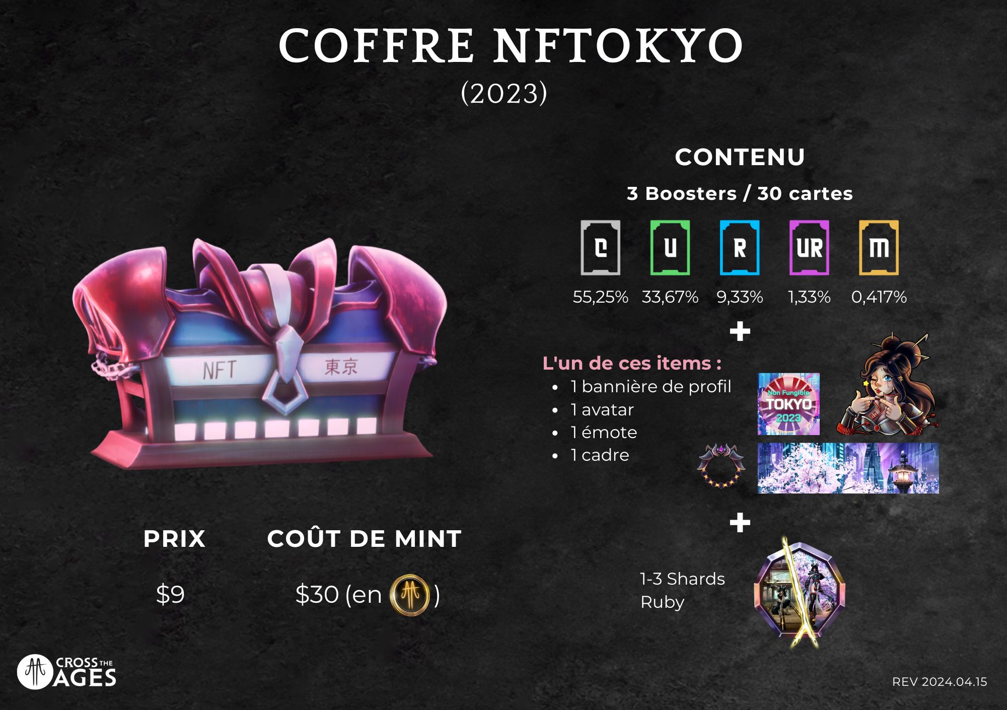 Le NFTokyo est le premier coffre renfermant des **shards** en format digital de carte exclusive pour réclamer ici **Ruby** pour l'occasion. À noter que le contenu des coffres NFTokyo acheté sur la **marketplace** est en format NFT, sauf les cosmétiques et shards qui seront à minter après ouverture.&#x20;