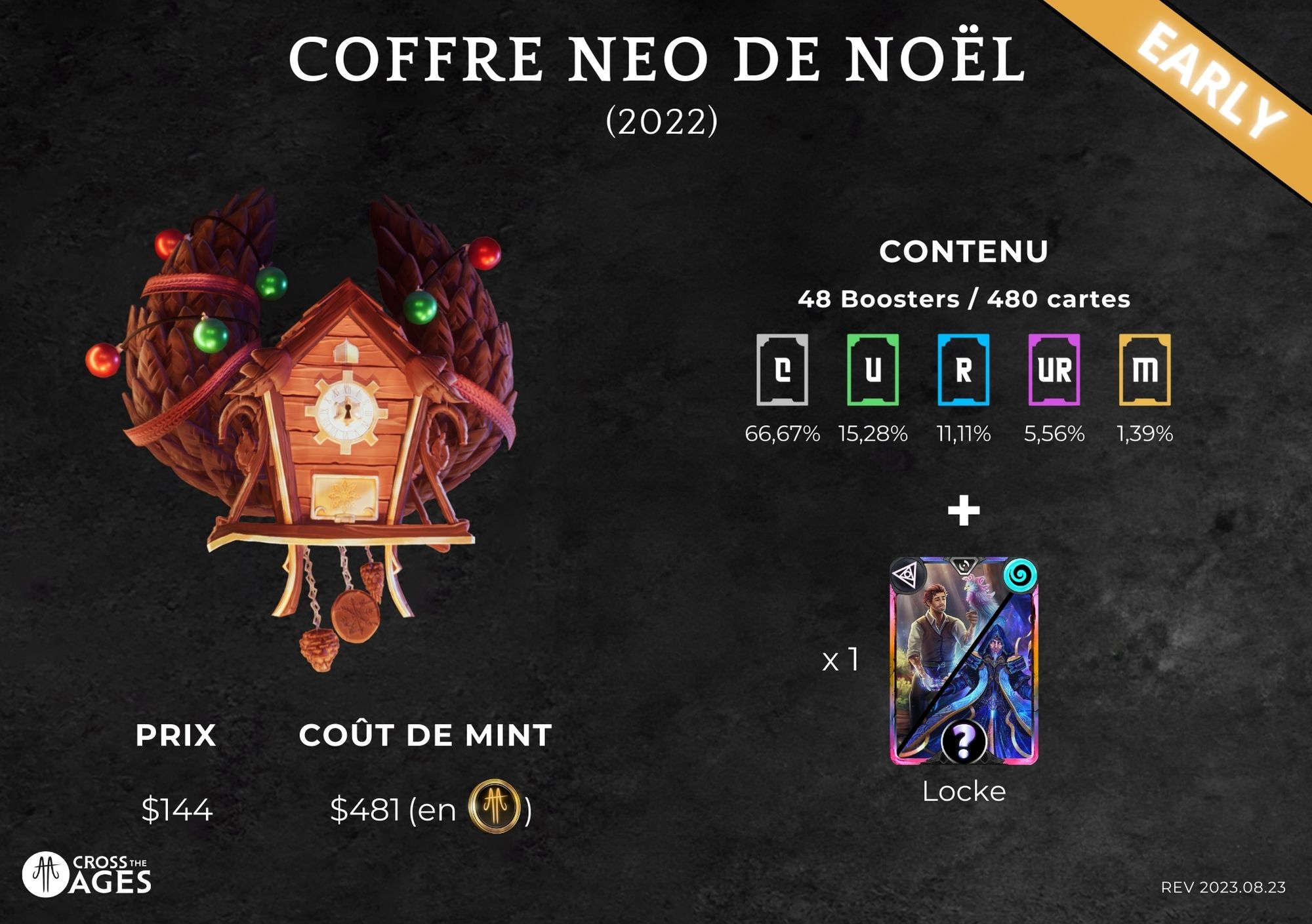 Pour Noël 2022, l'équipe CTA a voulu nous faire un petit cadeau à leur manière en incluant dans le coffre de Noël des **cartes déjà renforcées** *(*[*power up*](https://whitepaper.crosstheages.com/guide/fr/tcg/lartisanat/01-le-renforcement)*)*. **La carte Exclusive Locke est aussi disponible**.
