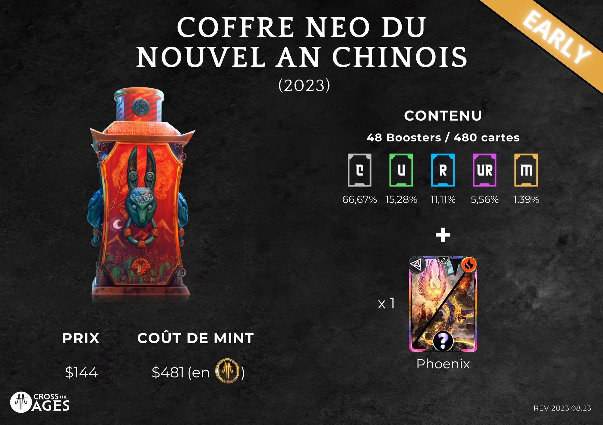 Étant un coffre **Early**, il contient un nombre de cartes UR et Mythiques supérieur. La **carte exclusive Phoenix** en version standard ou alternative, non-foil ou foil est disponible à l'intérieur.&#x20;
