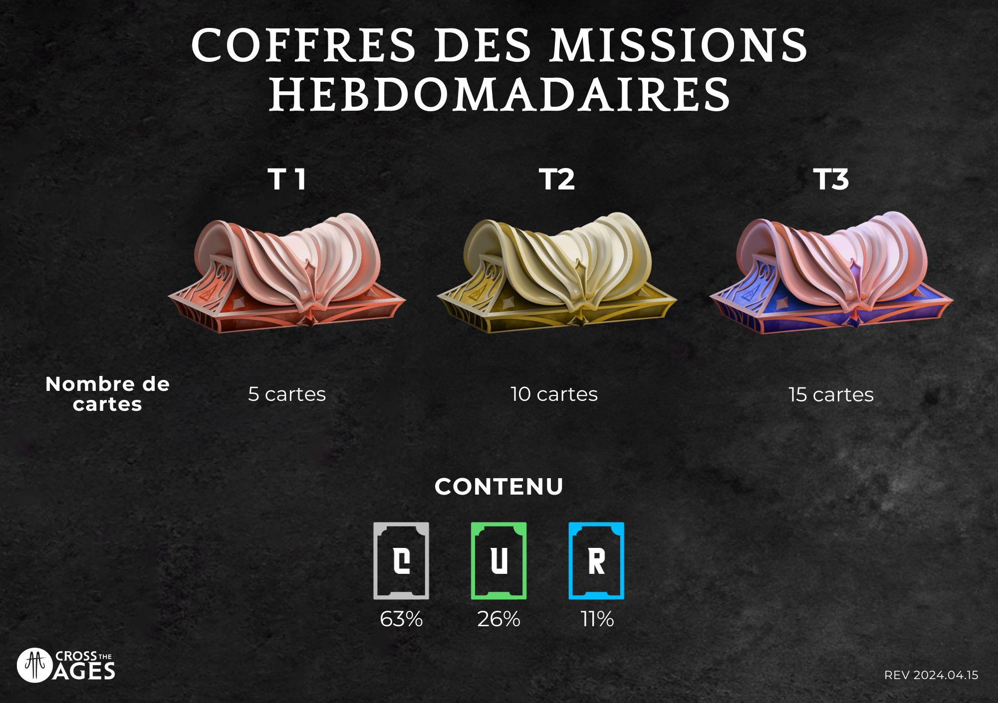 <figure><img src="https://1147870602-files.gitbook.io/~/files/v0/b/gitbook-x-prod.appspot.com/o/spaces%2FxKF8b8siLY5IN4AgOtmZ%2Fuploads%2FscUsRTBwGswGvHgLLQxI%2FWeekly%20Chests%20-%20FR.jpg?alt=media&#x26;token=4b0dfc78-9550-45f4-b678-cab20ee622af" alt=""><figcaption></figcaption></figure>