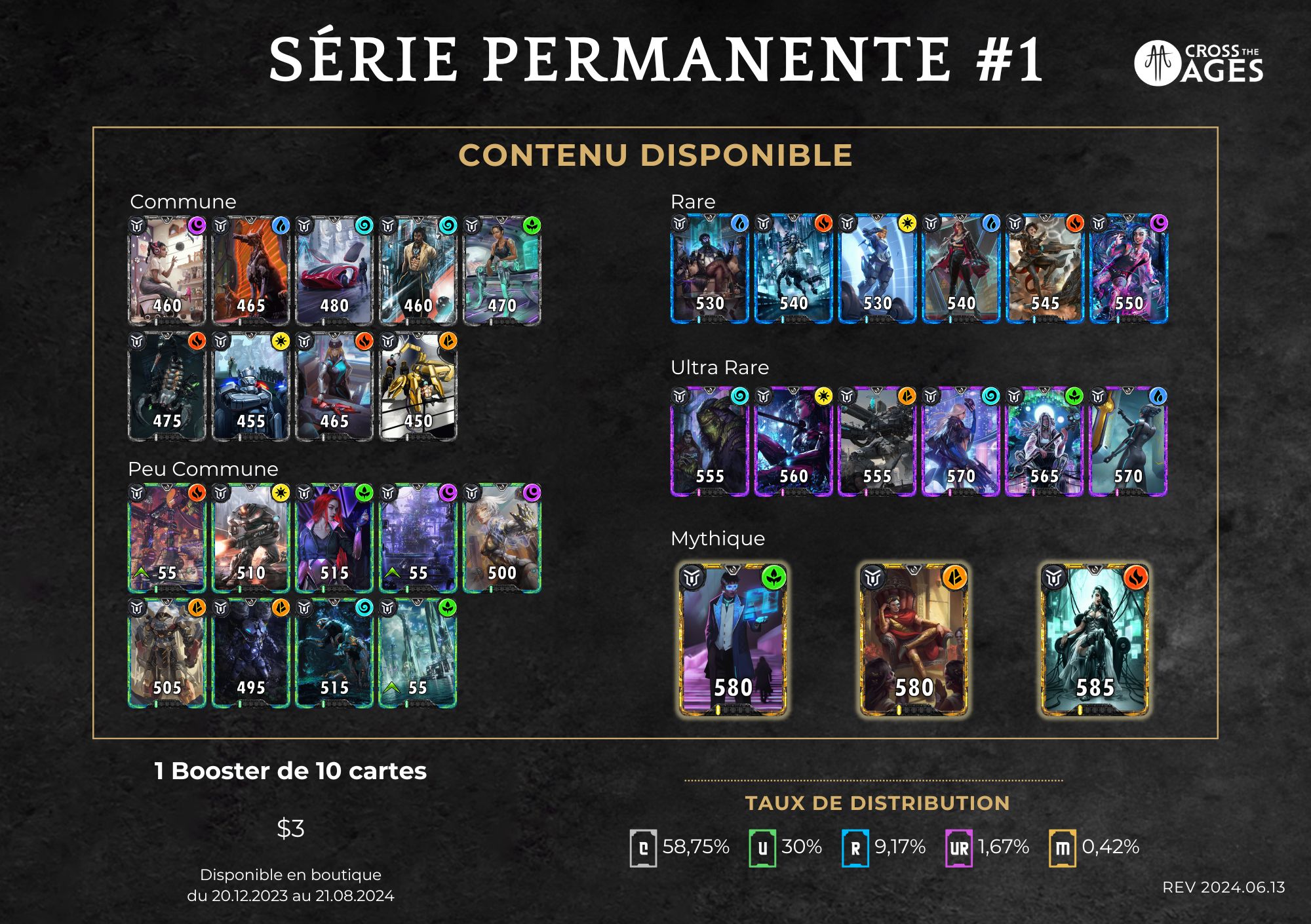 La Série Permanente #1 propose toutes les cartes précédemment disponibles dans les séries [#1 Hassan](#serie-1-hassan), [#2 Arhax](#h_01he2tcn1bc0pka6750gnp1446) et [#3 Shakti](#h_01he2tch8pn14yq9qssypsbn1y).&#x20;