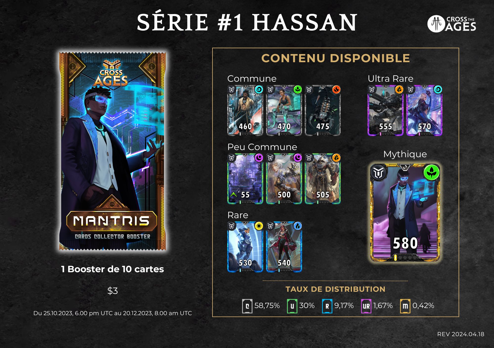 La Série Hassan propose pendant 8 semaines la **carte Mythique** Hassan, les **3 cartes Commune** Kunesh, Imari, Cyber-Scorpion, les **3 cartes Peu Commune** Off-Citizenship Zone (carte terrain), Heyla, ROMA WR-Serie, les **2 cartes Rare** Salome, Anis et les **2 cartes Ultra-Rare** Gygax, Judith. Une fois la Série terminée, toutes les cartes sont disponibles dans la [Série Permanente #1](#h_01hfsp2rz51hbfw56zyf1wy6f8).&#x20;