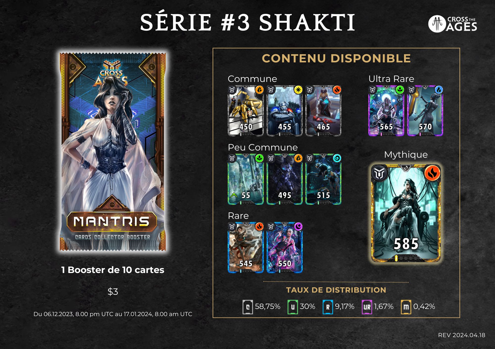 Durant la saison Mantris, il est possible d'acquérir les cartes de la collection via l'achat en boutique de Séries, des booster packs.
